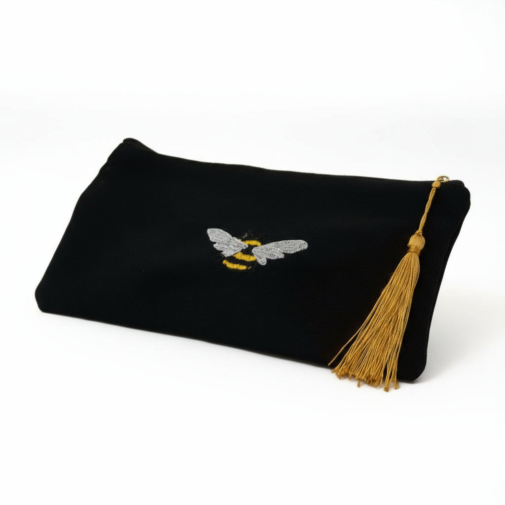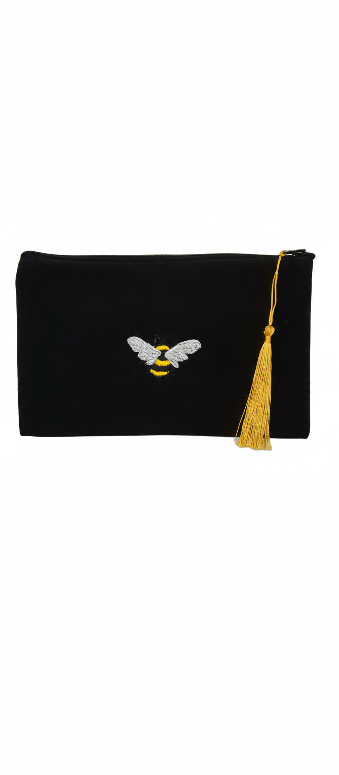 Black canvas pouch measuring 8'' x 5'' with an embroidered bee motif, a decorative gold tassel, and a black zip closure.